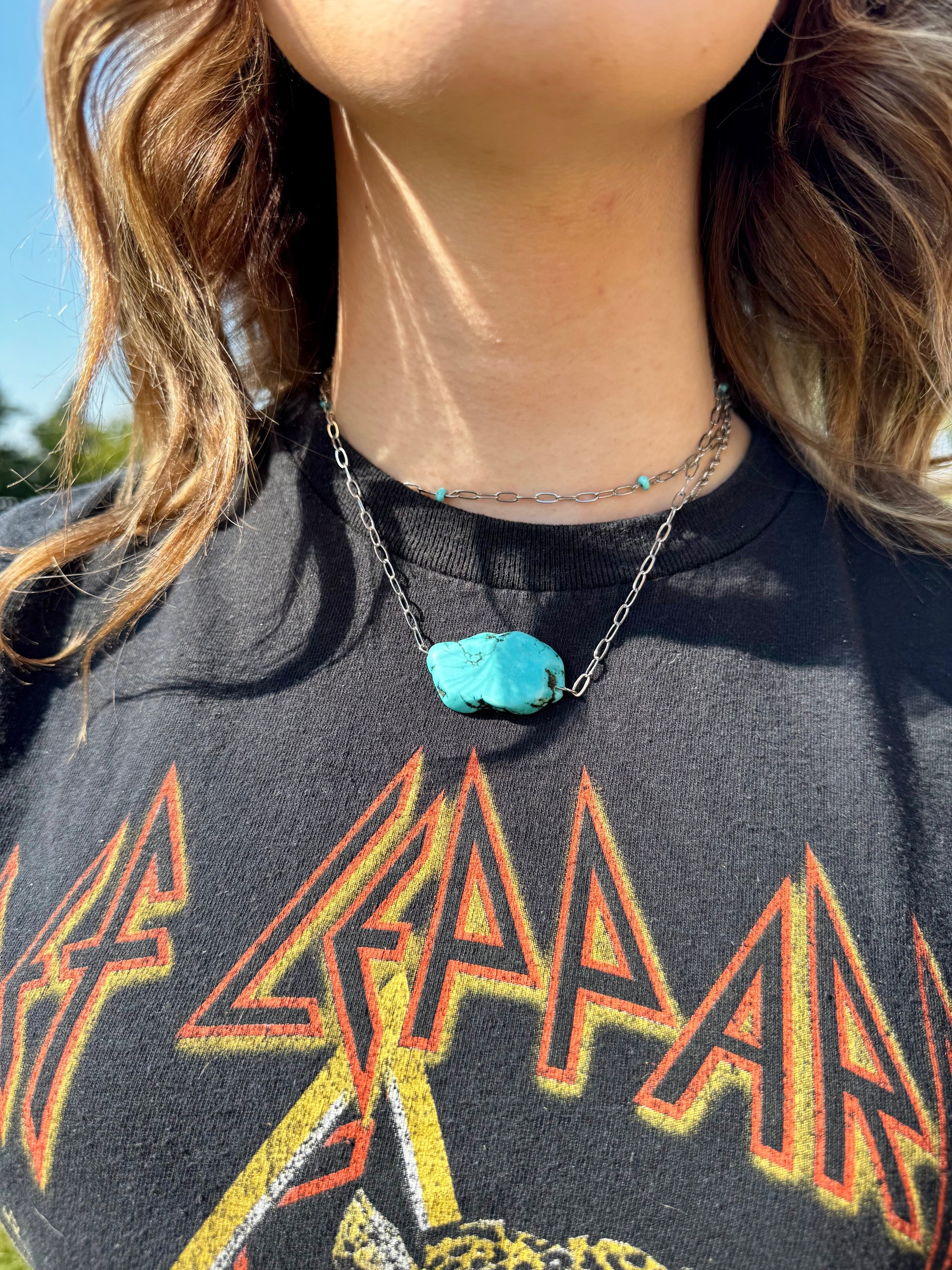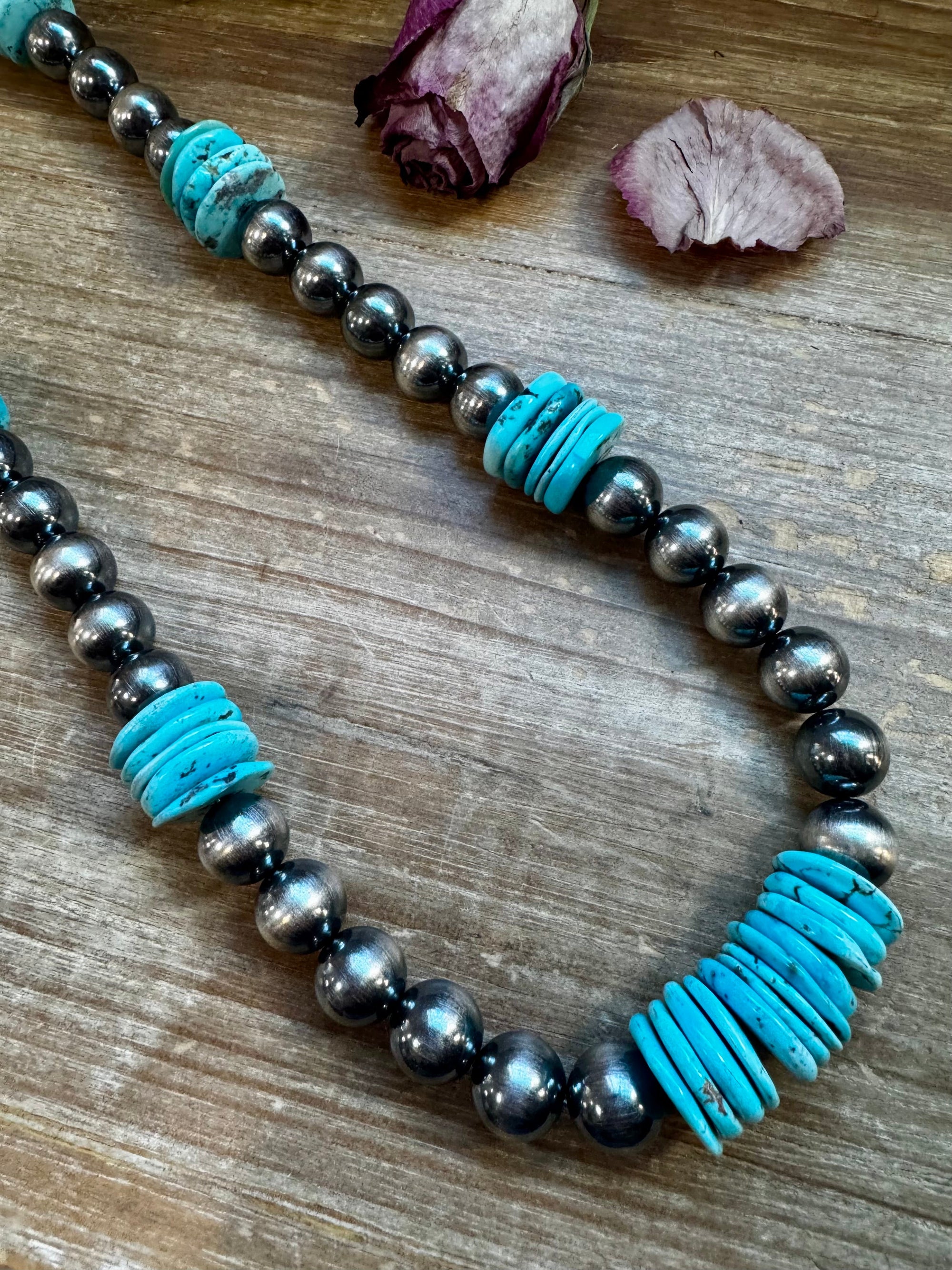 NFR Collection Necklace – 8mm & 14mm Sterling Silver Pearls with 20mm Turquoise Disc – Handmade by The Bijoux FAB – 23.5"