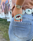 Make a bold statement with the Blazing Buffalo Scarf Slide, featuring an embroidered buffalo centerpiece framed by 12 vibrant turquoise beads. Set in polished silver, it blends rich tradition with rugged Western style
