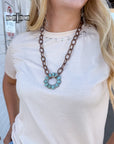 Bold, rustic, and rowdy in all the right ways. The Del Rio Necklace features a chunky distressed chain and a circular pendant framed with striking turquoise stones. It’s that perfect statement piece that layers with anything, bringing western grit and boutique charm to every outfit