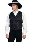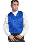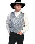 These elegant vests are made of silk jacquard. Features notched lapels two front pockets stamped metal buttons and an adjustable back strap. 100% silk jacquard. Fully lined. Made in usa.