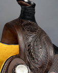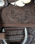 • ✔ FEATURE: This horse's saddle features a gorgeous hand tooled and carved design in a Hand finished Dark Brown color . Proprietary designed and extremely robust tree. Black rough out leather seat, 4.5-inch deep cantle. Leather covered Stirrups. Approx. 28 in Skirt Length and 38 lbs. weight, and 7 in Gullet.Full wide quarter horse bars.
